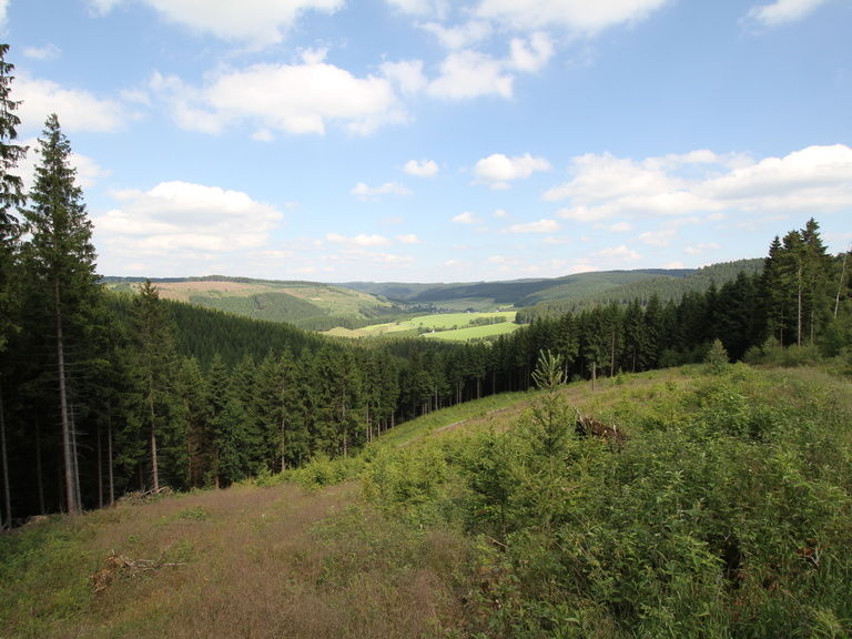 Mit dem Wanderbus fahren Sie nach Schanze. Bereits nach wenigen hundert Metern befinden Sie sich bereits auf dem Wald-Skulpturenweg, direkt am Kyrill-Pfad. Auch heute noch sind hier die Schäden zu sehen, die der Sturm 2007 angerichtet hat.