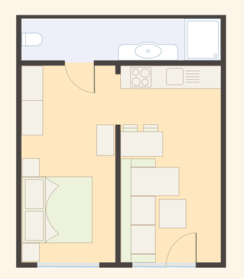 Das außergewöhnliche Appartement im Erdgeschoss erreichen Sie über einen separaten Eingang vom Hotel. Vor dem 34 m² großen Zimmer befindet sich eine Terrasse und es ist mit einer Kochnische ausgestattet.